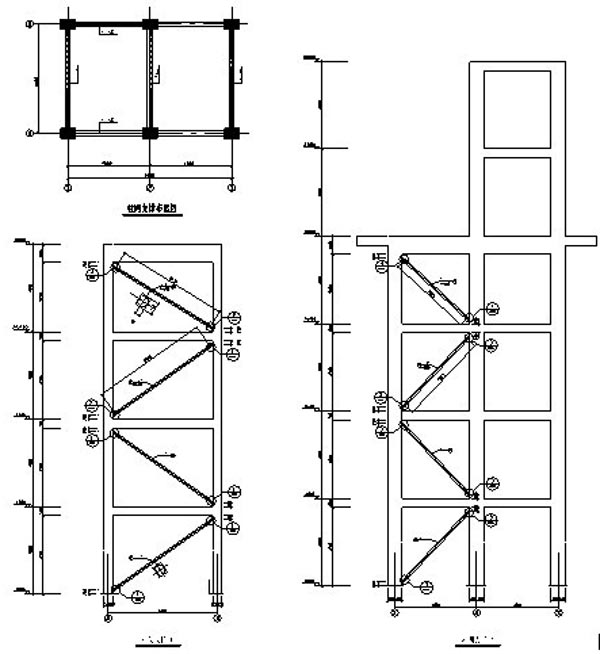 魯西化工廠銅洗框架,4層(局部6層)框架,頂部擱置一液體儲箱。使用過程中在風的作用下液面晃動,使結(jié)構(gòu)出現(xiàn)較大幅度振動,頂層有明顯振感。采取增加耗能鋼支撐的方法增強結(jié)構(gòu)剛度,減輕振動效應。