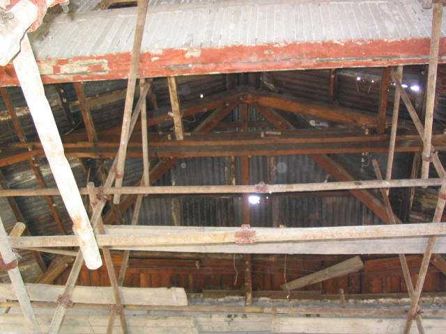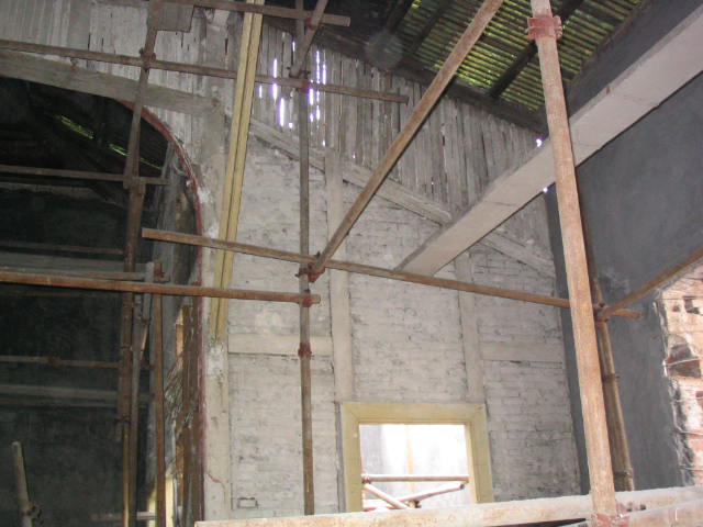 小廣寒影劇院原結(jié)構(gòu)為磚、石、木、鋼混和結(jié)構(gòu)。墻體由亂石、粘土磚用粘土、石灰雜砌而成,中間為鋼柱-鋼梁支撐,屋架為木結(jié)構(gòu),屋面為鐵皮屋面。室內(nèi)頂棚為板條麻刀粘土石灰頂棚,隔墻為木柱、木腰梁半磚隔墻。看臺(tái)為木結(jié)構(gòu)看臺(tái),木樓梯。小廣寒影劇院因年久失修,磚石墻、屋架、看臺(tái)、隔墻等大部分已破損、腐爛。本次修繕工作本著“修舊如舊”的原則,對(duì)建筑物進(jìn)行了針對(duì)性的改造加固
