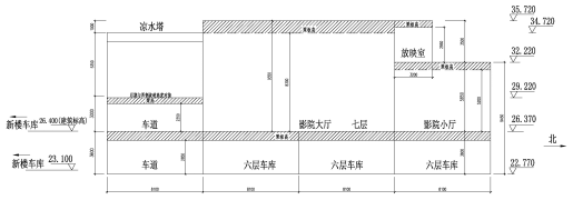 根據(jù)經(jīng)營要求,建筑物東側單體需進行加層改造,加層后,原五層頂屋面變?yōu)榱鶎?,作為車庫或?jīng)營使用,原五層新世紀影城搬遷至新建七層。加層設計時,結構標高布置需在滿足影廳凈高要求的同時兼顧新加樓層與周邊建筑物車道的交通銜接、屋頂涼水塔、影院放映廳、已有樓梯、電梯等,平面、剖面布置較為復雜,剖面見圖2。