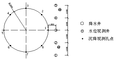 根據(jù)傾斜觀測(cè)結(jié)果沿?zé)焽枳畲髢A斜方向的垂直方向?qū)ΨQ設(shè)置5個(gè)降水井(圖2),沉降觀測(cè)點(diǎn)沿?zé)焽璧撞恐荛L范圍等距離布置。經(jīng)過合理的設(shè)計(jì)和精心施工,整個(gè)糾偏工作取得圓滿成功,煙囪的傾斜率達(dá)到并穩(wěn)定在合同規(guī)定的0.8‰之內(nèi)。
