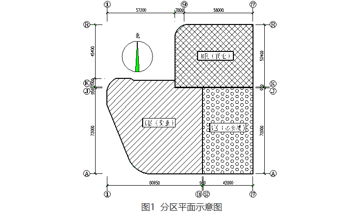 本工程地下部分連為整體,地上部分設(shè)置抗震縫,將整個(gè)結(jié)構(gòu)分為三個(gè)獨(dú)立的結(jié)構(gòu)單元:超高層辦公樓及與之連為一體的裙樓部分為A區(qū),A區(qū)北側(cè)的商業(yè)裙樓部分為B區(qū),A區(qū)西側(cè)的商業(yè)裙樓部分為C區(qū),青島銀座結(jié)構(gòu)分區(qū)示意圖見圖1。