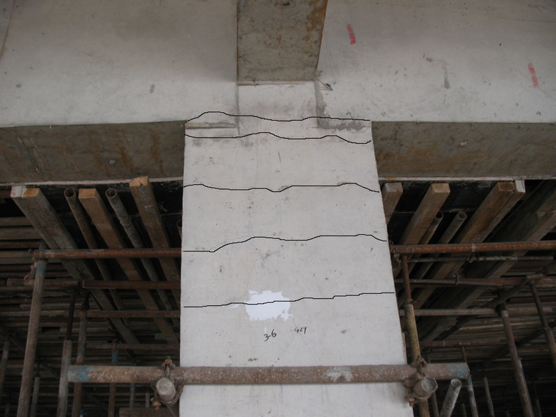 主體結(jié)構(gòu)現(xiàn)已封頂,在2014年元旦左右,拆除E區(qū)一二層頂BDF大板模板后,發(fā)現(xiàn)一層~三層頂大板四周柱與相關(guān)梁出現(xiàn)不同程度的裂縫,隨之二層頂BDF大板也出現(xiàn)板底裂縫。